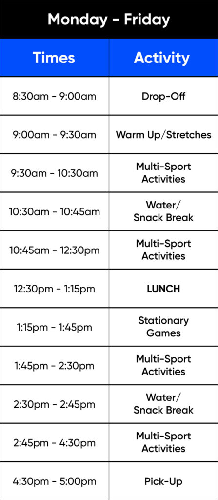 *Please note that start and end times will vary by location. Double check your registration confirmation or on your DaySmart account for your child(ren)’s camp times.